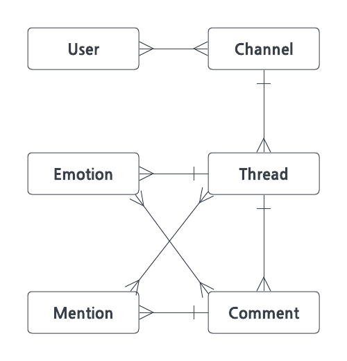 - Comment : 쓰레드내 댓글로 쓰레드와 다대일 관계를 가지며 이모지, 멘션과도 관계를 가진다.