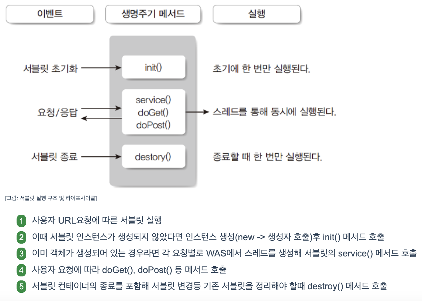 "서블릿은 클라이언트 요청을 처리하기 위해 특정 메서드를 실행하며, 최초 실행부터 종료까지 다음과 같은 흐름을 따른다!"